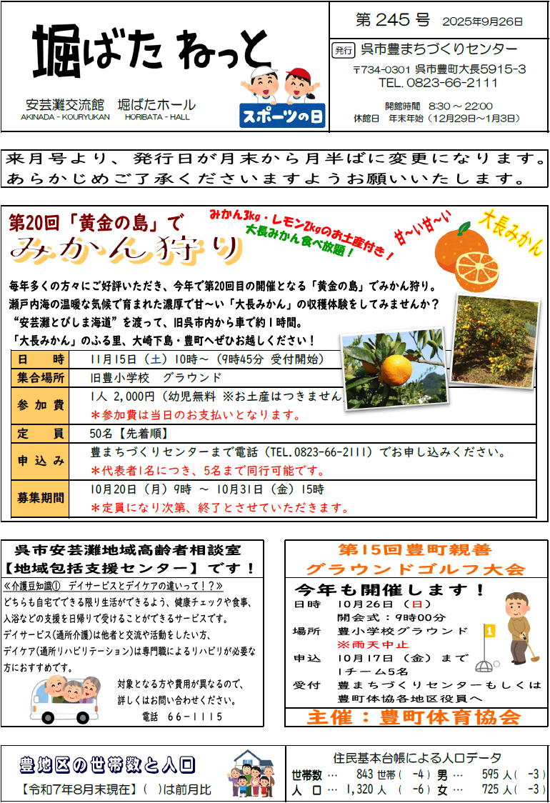 第245号の内容は、堀ばたねっと発行日の変更について、みかん狩りの参加者募集についてなどです。