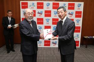 9時30分 庁内での呉交通安全協会の 大之木 晴樹 会長からの呉交通安全協会70周年記念交通安全に関する懸垂幕贈呈式 | |