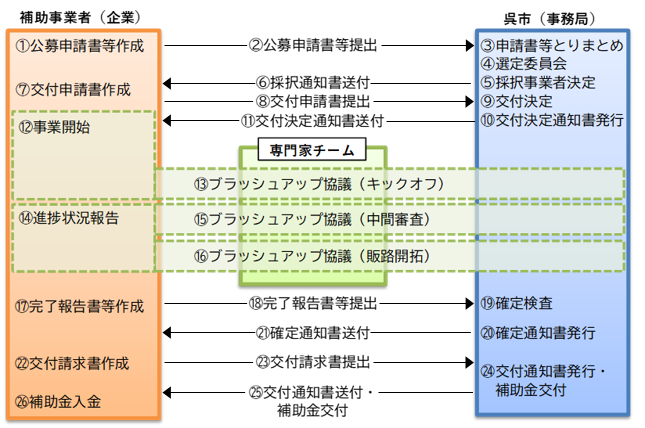 本事業は,呉市が実施するもので,本補助金運営事務局として呉市産業部商工振興課が窓口となり,専門家チームとともに以下の仕組みにより支援対象事業者への支援を行います。