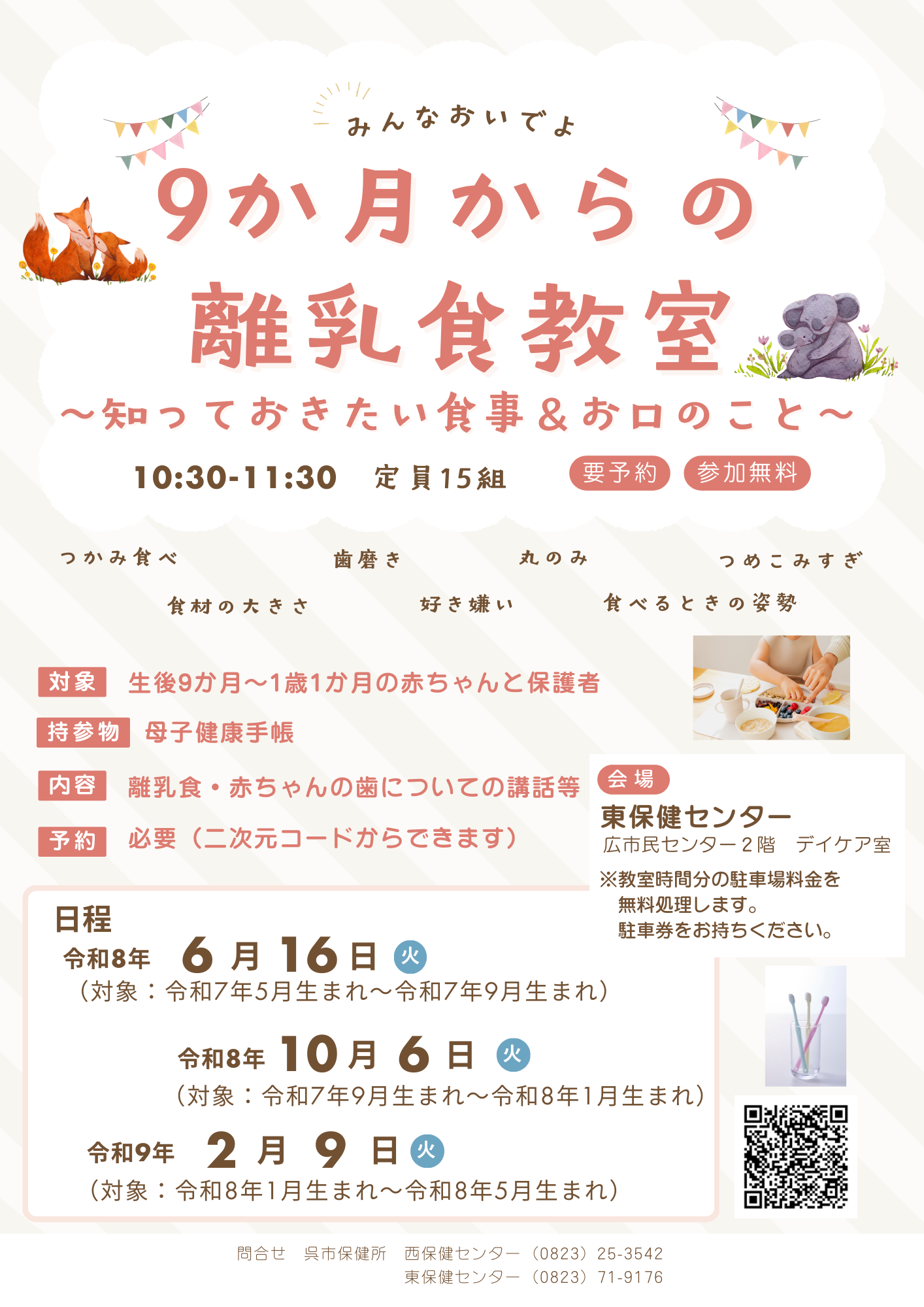 呉市では月齢別に東西保健センターで離乳食教室を開催しています。