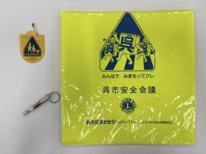 新入学児童の交通安全を願い,次の寄贈団体から,それぞれ交通安全黄色いランドセルカバー,交通事故傷害保険付き黄色いワッペン,防犯ホイッスルを呉市安全会議に寄贈いただき,市内の新入学児童(約1,150名)に配付いたします。